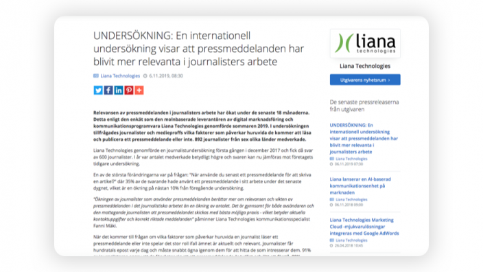 Med vår PR & Media-lösning kan du publicera dina pressmeddelanden på vår LianaPress™-portal och ditt eget pressrum.